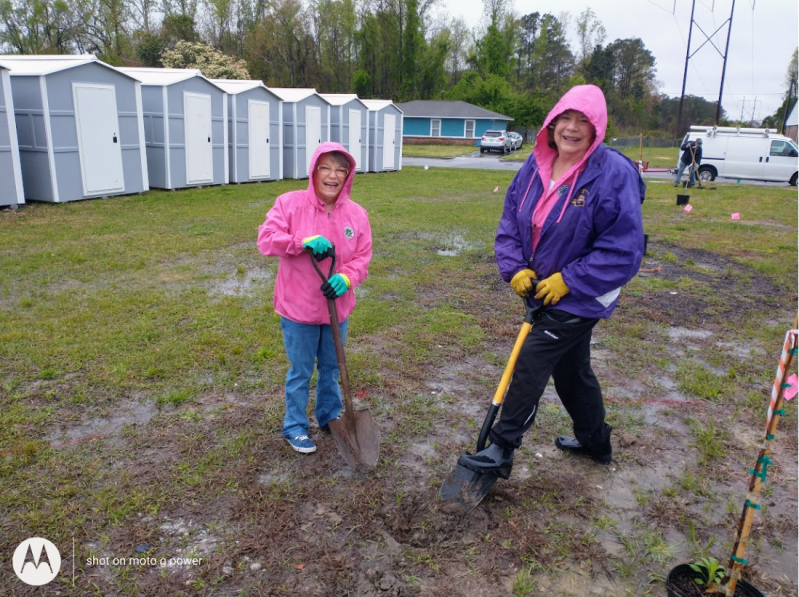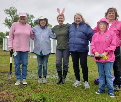 On Thursday, March 28, 2024 several members of the Cape Fear Garden Club “Arbor Day” and “Gardening for Wildlife” committees braved wet conditions to plant seven native trees at Eden Village. The planting of these trees served as both the recognition of North Carolina Arbor day that is celebrated in the month of March and as one of many requirements needed to certify the city of Wilmington as a wildlife community.